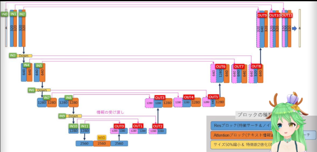 UNET使用使用小卷积核,则IN0~2关注微小特征(如毛发,纹理)。通过IN3,6,9每次将图像缩小一半,则可以进一步提取全局特征(如动作,环境),在OUT3~5对图像进行整体放大补充,即影响出图全局特征,后面同理OUT9~11影响出图细节特征