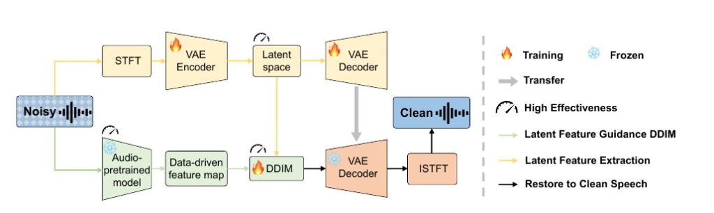 | (BO)Pre-training Feature Guided Diffusion Model for Speech Enhancement | [arxiv-2024.6.14] FUSE | 语音增强 | 创新点1:使用VAE提取隐空间特征,减少训练量 创新点2:使用预训练声学模型(BEATs)提取特征,并作为DDIM的条件项,引导扩散模型 创新点3:将训练好的VAE-Decoder权重冻结,接在DDIM之后 | 文中明确指出扩散模型的性能、效率、训练步骤和推理时间都阻碍了它们在语音增强中的表现,该方法主要是针对效率的改进 使用DDIM确实可以有效减少采样步骤,不知道SDE是否有对应的方法 | STCN/CDiffuse/DVAE/SGMSE/SGMSE+/MetricGAN+/Conv-TasNet | WSJ0-CHiME3/VB-Demand | POLQA PESQ ESTOI SI-SDR SI-SIR SI-SAR DNSMOS |