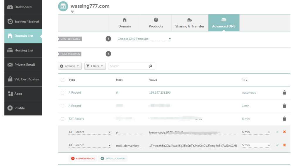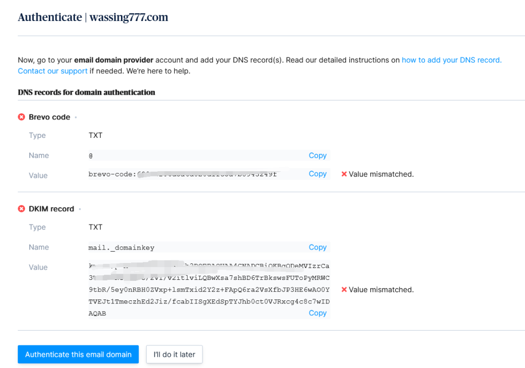 添加域名并选择域名提供商后,会出现域名验证内容,此时需要把Brevo提供的验证信息添加至域名提供商的你的域名对应记录(我用的提供商是Namecheap)