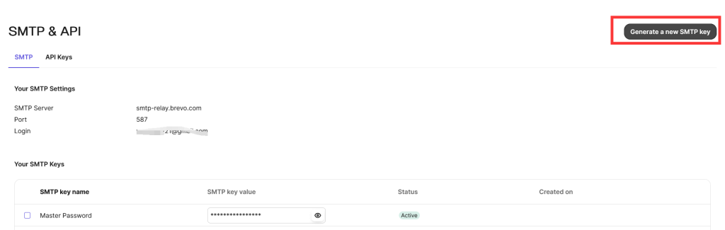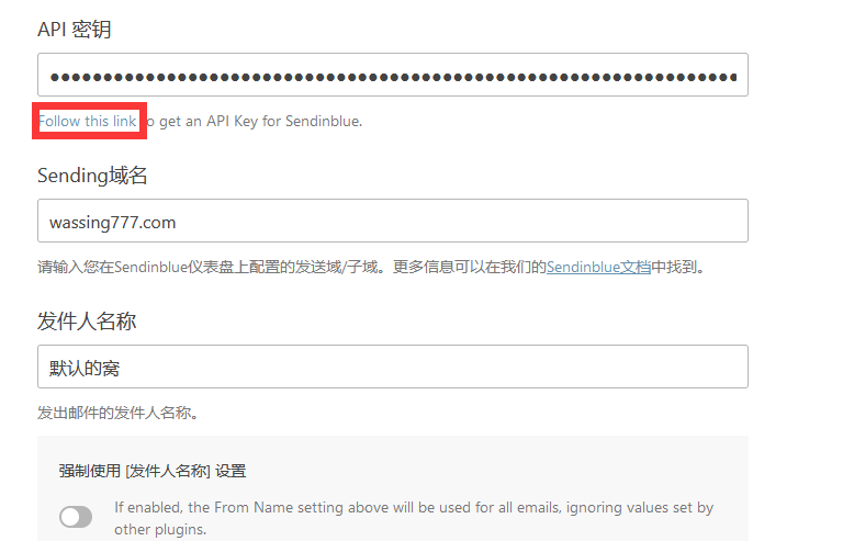 然后回到WP Mail SMTP插件安装向导,填入邮件功能基本信息,API密钥点击提供的链接后在Brevo即可获取新的API密钥